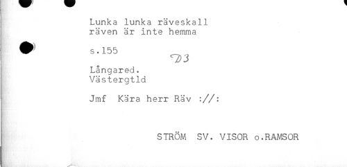 //// i Lunka lunka räveskall //// i räven är inte hemma //// # S.155 <rpj //// ] Långared. //// Västergtld //// ' Jmf Kära herr Räv ://: //// i STRÖM SV. VISOR o.RAMSOR ////