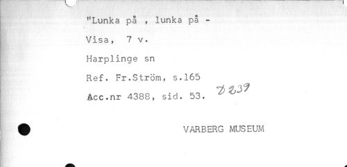 //// "Lunka på , lunka på - //// Visa, 7 v. //// Harplinge sn //// Ref. Fr.Ström, s.165 //// Acc.nr 4388, sid. 53. //// * //// . //// ^ VARBERG MUSEUM ////