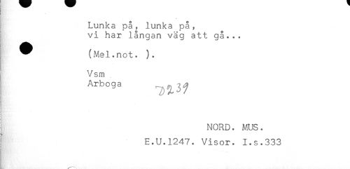 //// Lunka på, lunka på, //// vi har långan väg att gå... //// ^ (Mel.not. ). //// Vsm //// Arboga ^^^ //// ! //// § //// i //// i NORD. MUS. //// ! E.U.1247. Visor. I.s.333 ////