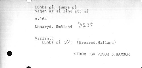 //// Lunka på, lunka på //// vägen är så lång att gå //// * //// s.164 //// Unnaryd, Småland - ^ ^ ^ //// Variant: //// Lunka på ://: (Breared,Halland) //// # STRÖM SV VISOR o.RAMSOR ////