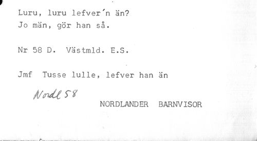 //// Luru, luru lefver'n än? //// Jo män, gör han så. //// Nr 58 D. Västmld. E.S. //// * //// Jmf Tusse lulle, lefver han än //// NORDLANDER BARNVISOR ////