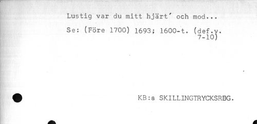 //// Lustig var du mitt hjärt' och mod... //// Se: (Före 1700) 1693; 1600-t. (def.v. //// 7-10) //// < //// . //// * //// ^ KB:8 SKILLINGTRYCKSREG. ////