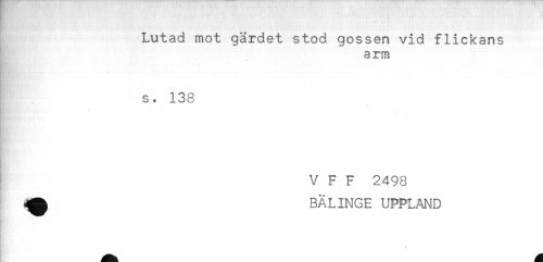 //// Lutad mot gärdet stod gossen vid flickans //// arm //// * //// - //// - //// s. 138 //// . //// . //// ' V F F 2498 //// ^ BÄLINGE UPPLAND //// ? ////