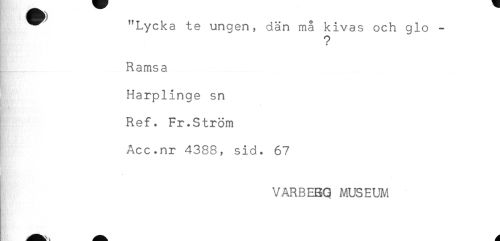 //// ^ "Lycka te ungen, dän må kivas och glo - //// Q //// + //// Ramsa //// Harplinge sn //// Ref. Fr.Ström //// Acc.nr 4388, sid. 67 //// c //// VARBEBQ MUSEUM ////