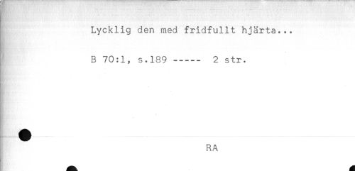 //// _ _ ... //// Lycklig den med fridfullt hjärta... //// B 70:1, s.189 ----- 2 str. //// < //// t //// - //// . //// * //// i RA ////