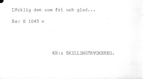 //// LYcklig den som fri och glad... //// Se: E 1843 v //// ! //// KB:s SKILLINGTRYCKSREG. //// # ////