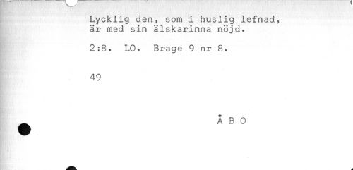 //// Lycklig den, som i huslig lefnad, //// är med sin älskarinna nöjd. //// 2:8. LO. Brage 9 nr 8. //// 49 //// ^ ÅBO ////
