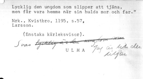 //// Lycklig den ungdom som slipper att tjäna, //// men får vara hemma när sin hulda mor och far." //// Nrk., Kvistbro, 1195, s.57, //// Larsson. //// t. //// (Enstaka kärleksvisor). //// ^ U L M A /Y ^^ . . ////