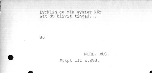 //// ! Lycklig du min syster kär //// att du blivit tingad... //// SÖ //// Hå //// - //// t ^ NORD. MUS. //// ^ Mskpt III s.893. ////