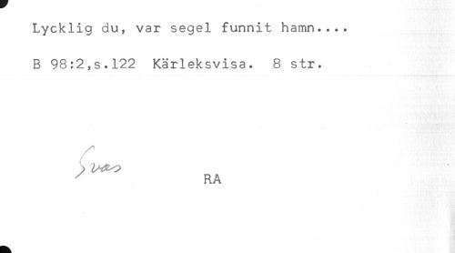 //// Lycklig du, var segel funnit hamn.... //// B 98:2,s.122 Kärleksvisa. 8 str. //// ^ RA ////