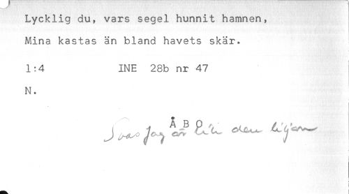 //// Lycklig du, vars segel hunnit hamnen, //// Mina kastas än bland, havets skär. //// 1:4 INE 28b nr 47 //// N. //// < //// ! //// t ////