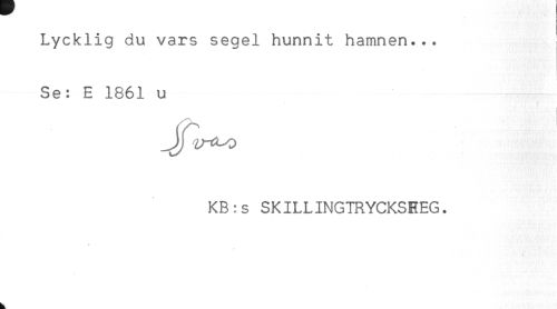 //// Lycklig du vars segel hunnit hamnen... //// Se: E 1861 u //// KB:s SKILLINGTRYCKSREG. ////
