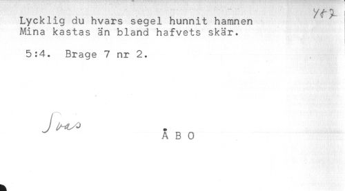 //// Lycklig du hvars segel hunnit hamnen //// Mina kastas än bland hafvets skär. //// 5:4. Brage 7 nr 2. //// t //// A B O ////