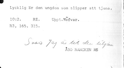 //// Lycklig är den ungdom som slipper att tjena, //// 10:2. RE. Uppt.Wefvar. , //// < //// R3, 165, 315. ! //// i //// ÅBO ROCKEN MS ' ' //// k Y ////