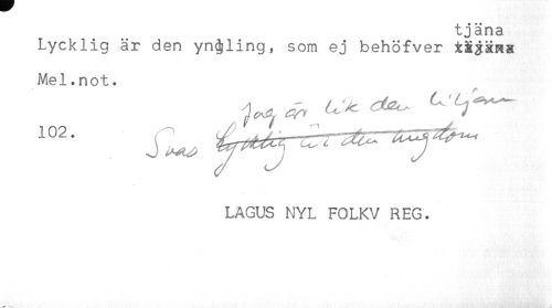 //// tjäna //// Lycklig är den yngling, som ej behöfver //// Mel.not. //// LAGUS NYL FOLKV REG. ////