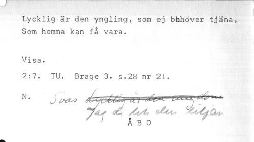 //// Lycklig är den yngling, som ej bhhöver tjäna, //// Som hemma kan få vara. //// Visa. //// * //// 2:7. TU. Brage 3. s.28 nr 21. ////