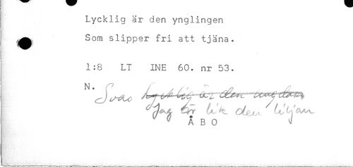 //// Lycklig är den ynglingen //// j Som slipper fri att tjäna. //// 1:8 LT INE 60. nr 53. //// ÅBO ^ //// . ////