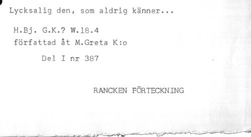 //// Lycksalig den, som aldrig känner... //// H.Bj. G.K.? W.18.4 //// författad åt M.Greta K:o //// Del I nr 387 //// RANCKEN FÖRTECKNING ////