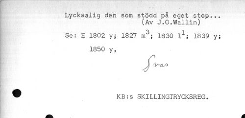 //// Lycksalig den som stödd på eget stop... //// (Av J.O.Wallin) //// Se: E 1802 y; 1827 m^; 1830 1"*"; 1839 y; //// - //// 1850 y, //// ^ KB:s SKILLINGTRYCKSREG. //// - ////