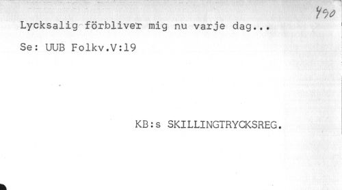//// Lycksalig förbliver mig nu varje dag... //// Se: UUB Folkv.V:19 //// * //// t //// i //// i //// KB:s SKILLINGTRYCKSREG. ////