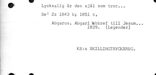 //// ^ Lycksalig är den själ som tror... //// Se: zz 1843 b; 1851 c, //// Abgarus. Abgariixbbref till Jesum... //// 1829. (Legender) //// KB:s SKILLINGTRYCKSREG. ////