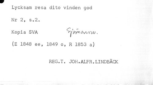 //// Lycksam resa dito vinden god //// Nr 2, s.2. //// Kopia SVA //// (E 1848 ee, 1849 o, R 1853 a) //// REG.T. JOH.ALFR.LINDBÄCK ////