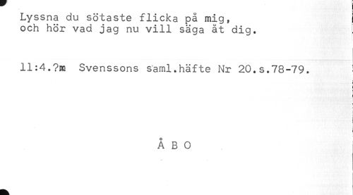 //// Lyssna du sötaste flicka på mig, ! //// och hör vad jag nu vill säga åt dig. //// 11:4.?m Svenssons saml.häfte Nr 20.s.78-79. ! //// t //// i //// t //// t //// ÅBO ////