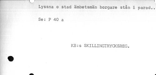 //// Lyssna o stad ämbetsmän borgare stån i parad.. //// Se: P 40 a //// KB:s SKILLINGTRYCKSREG. //// " + ; ////