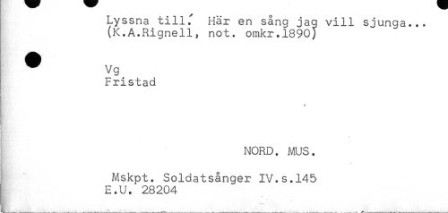 //// Lyssna till^ Här en sång jag vill sjunga... //// (K.A.Rignell, not. omkr.1890) //// ^ Vg //// Fristad //// NORD. MUS. //// Mskpt. Soldatsånger IV.s.145 //// E.U. 28204 //// . . . ////