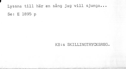 //// Lyssna till här en sång jag vill sjunga... //// Se: E 1895 p //// KB:s SKILLINGTRYCKSREG. ////