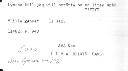 //// Lyssna till jag vill beratta om en liten spad //// martyr //// "Lilla KAnna" 11 str. //// 11482, s. 948 //// SVA Kop //// J //// U L M A BLIXTS SAML. //// ^ay / ^ ////