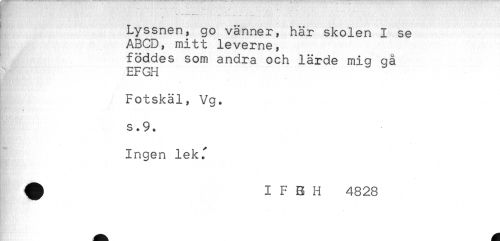 //// ' Lyssnen, go vänner, här skolen I se //// ABCD, mitt leverne, //// föddes som andra och lärde miq qå //// EFGH //// Fotskäl, Vg. //// s.9. //// Ingen lekf //// ^ I F B H 4828 //// A ^ ////