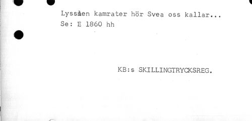 //// Lyss&en kamrater hör Svea oss kallar... //// Se: E 1860 hh //// r iH //// KB:s SKILLINGTRYCKSREG. //// L //// * . * - ////