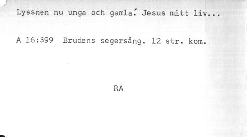 //// Lyssnen nu unga och gamlaf Jesus mitt liv... //// ! //// A 16:399 Brudens segersång. 12 str. kom. //// ! //// < //// t //// ) //// RA ////