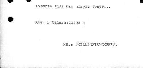 //// Lyssnen till min harpas toner... //// ^ KSe: F Stiernstolpe a //// !< '. ^ //// KB:s SKILLINGTRYCKSREG. ////