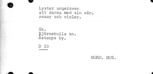 //// ^ Lyster ungersven //// att dansa med sin vän, //// rosor och violer. //// Sk. //// gjörnekulla sn. //// Åstorps by. //// D 33 //// NORD. MUS. //// K - * ////