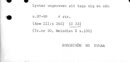 //// Lyster ungersven att taga sig en vän //// ^ s.97-98 4 str. //// (Arw III:s 260) (D 33) //// (Tr.nr 30, Melodien å s.100) //// BORGSTRÖM MS KVHAA //// * ////