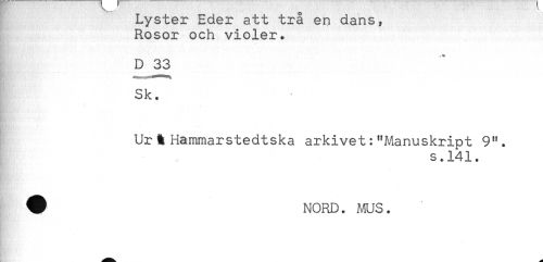 //// Lyster Eder att tra en dans, //// Rosor och violer. //// D 33 //// Sk. //// Urt Hammarstedtska arkivet: "Manuskript 9". //// s.141. //// # NORD. MUS. //// ' ////