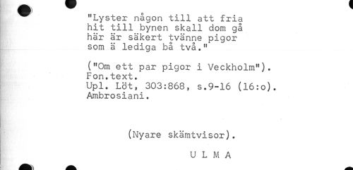 //// ^ "Lyster någon till att fria //// hit till bynen skall dom gå //// här är säkert tvänne pigor //// som ä lediga bå två." //// ("Om ett par pigor i Veckholm"). //// Fon.text. //// Upl. Löt, 303:868, s.9-16 (l6:o). //// Ambrosiani. //// - //// (Nyare skämtvisor). //// U L M A ////