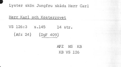//// Lyster skön Jungfru skada Herr Carl //// Herr Karl och Kosterrovet //// VS 126:3 s.145 14 str. //// (Afz 24) (DgF 409) //// AFZ MS KB //// KB VS 126 ////