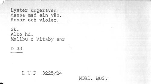 //// Lyster ungersven //// dansa med sin vän. //// Rosor och violer, //// Sk. //// Albo hd. //// Mellbu o Vitaby snr //// D 33 //// L U F 3225/24 //// NORD. M. ////