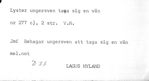 //// Lyster ungersven ta^a sig en vän //// nr 277 c), 2 str. V.N. //// Jmf Behagar ungersven att taga sig en vän //// mel.not //// " ^ ' LAGUS NYLAND ////
