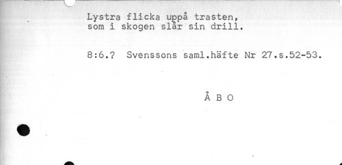 //// Lystra flicka uppå trasten^ //// som i skogen slår sin drill. //// 8:6.? Svenssons saml.häfte Nr 27.s.52-53. //// f'?.", -'/t,-? K- //// ÅBO ////