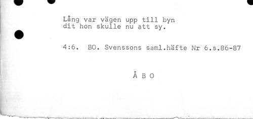 //// Lång var vägen upp till byn //// dit hon skulle nu att sy. //// 4:6. BO. Svenssons saml.häfte Nr 6.s.86-87 //// ÅBO //// ) . ' " ////