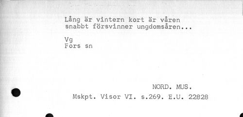 //// Lång är vintern kort är våren //// snabbt försvinner ungdomsåren... //// Vg //// Fors sn //// - //// NORD. ms. //// ^ Mskpt. Visor VI. s.269. E.U. 22828 ////