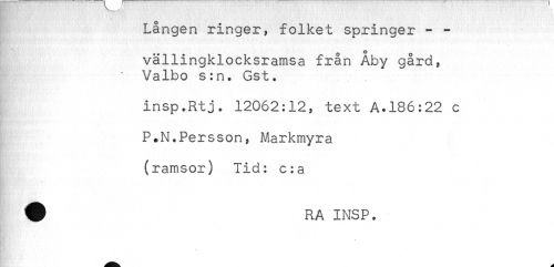//// Lången ringer, folket springer - - //// vällingklocksramsa från Åby gård, //// * Valbo s:n. Gst. //// insp.Rtj. 12062:12, text A.186:22 c //// P.N.Persson, Markmyra //// (ramsor) Tid: c:a //// * . //// # RA INSP. ////