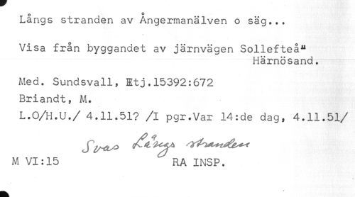 //// O o //// Langs stranden av Angermanälven o säg... //// Visa från byggandet av järnvägen Sollefteå" //// Härnösand. //// Med. Sundsvall, Ktj.15392:672 //// Briandt, M. //// L.O/H.U./ 4.11.51? /I pgr.Var 14:de dag, 4.11.51 //// /M VI:15 RA INSP. ////