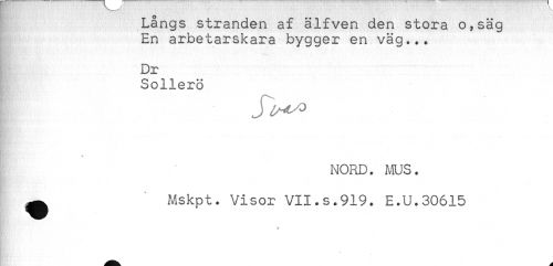 //// Långs stranden af älfven den stora o,säg //// En arbetarskara bygger en väg... //// Dr //// Sollerö //// - //// NORD. MUS. //// ^ Mskpt. Visor VII.s.919. E.U.30615 //// * //// * ////