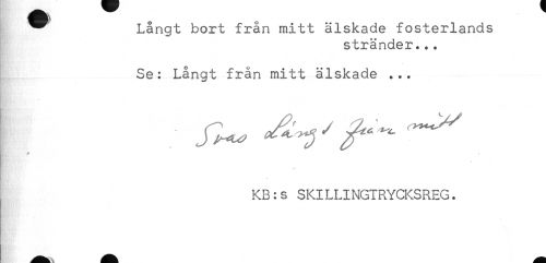 //// ^ Långt bort från mitt älskade fosterlands //// stränder... //// Se: Långt från mitt älskade ... //// # //// KB:s SKILLINGTRYCKSREG. ////
