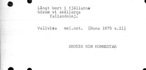 //// Långt bort i fjällarne //// hörom vi skällorna //// fallandolej f //// Vallvisa mel.not. (Runa 1875 s.21) //// BRODIN RIM KOMMENTAR //// * ////